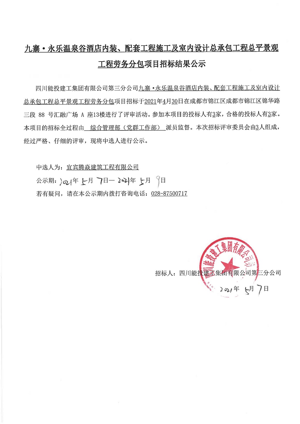 九寨.永乐温泉谷酒店内装、配套工程施工及室内设计总承包工程总平景观工程劳务分包招标结果公示