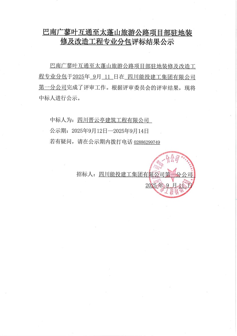 巴南广蓼叶互通至太蓬山旅游公路项目部驻地装修及改造工程专业分包结果公示
