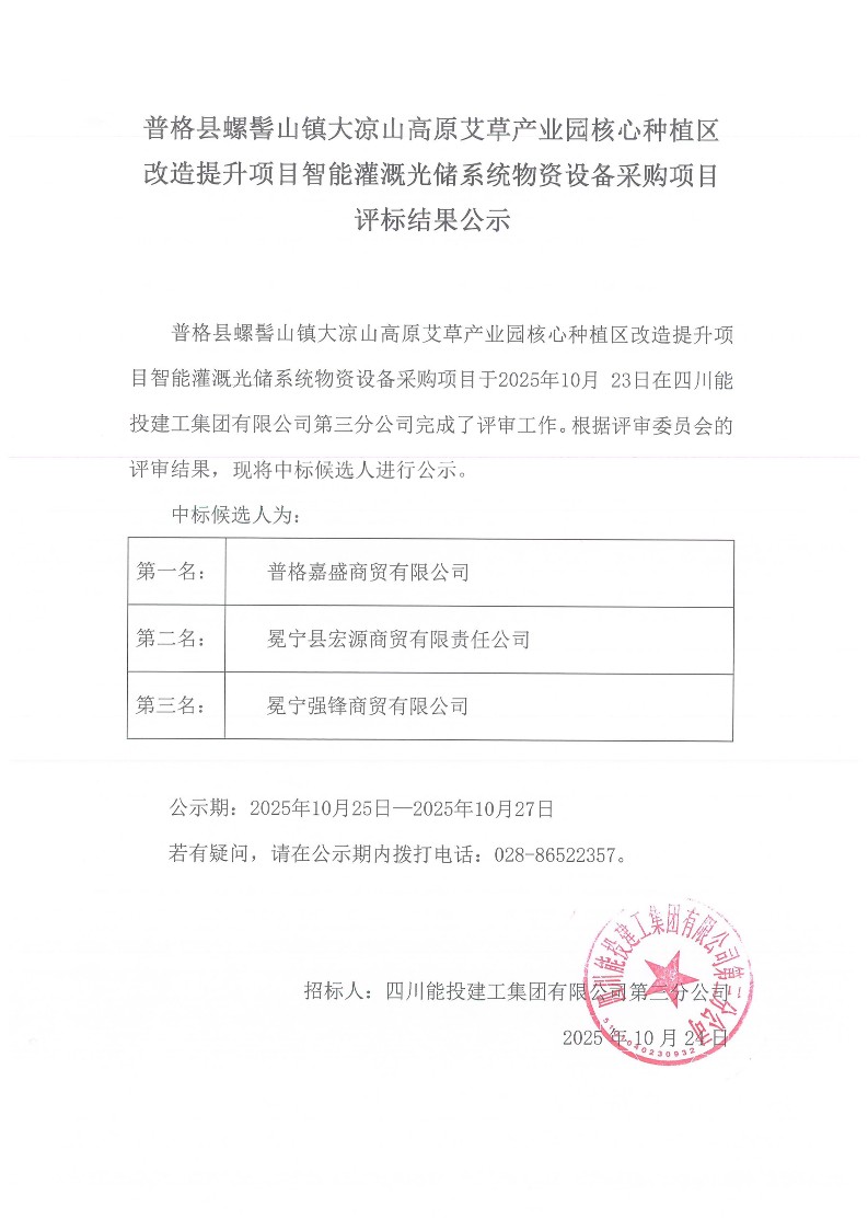 普格县螺髻山镇大凉山高原艾草产业园核心种植区改造提升项目智能灌溉光储系统物资设备采购结果公示