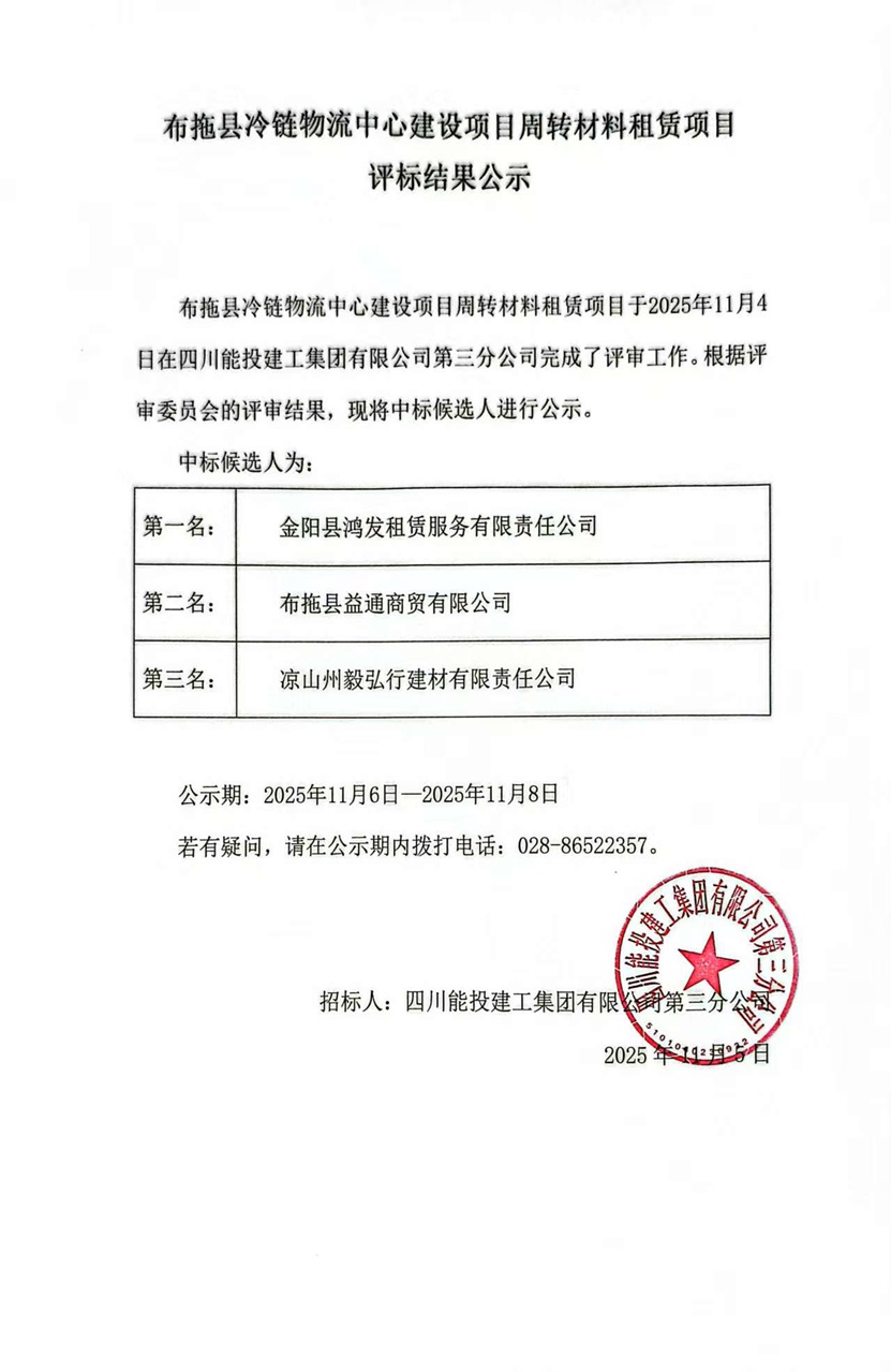 布拖县冷链物流中心建设项目周转材料租赁结果公示