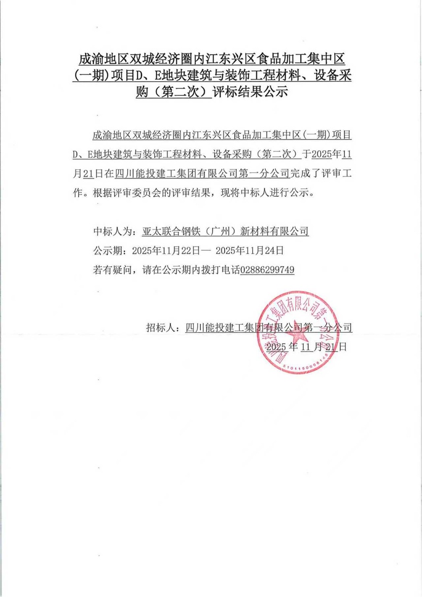 成渝地区双城经济圈内江东兴区食品加工集中区(一期)项目D、E地块建筑与装饰工程材料、设备采购(第二次)结果公示