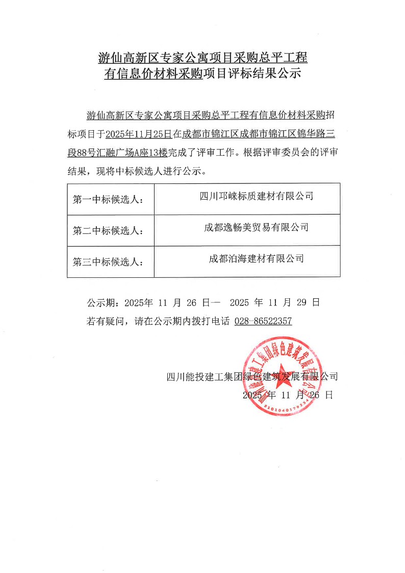 游仙高新区专家公寓项目采购总平工程有信息价材料采购结果公示