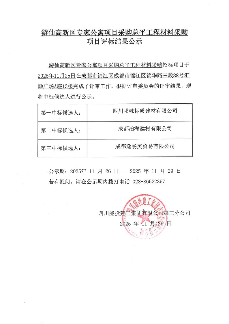 游仙高新区专家公寓项目总平工程材料采购结果公示