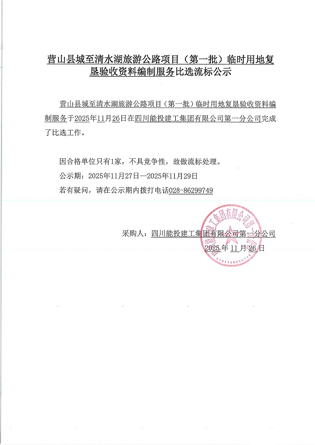 营山县城至清水湖旅游公路项目(第一批)临时用地复垦验收资料编制服务流标公示