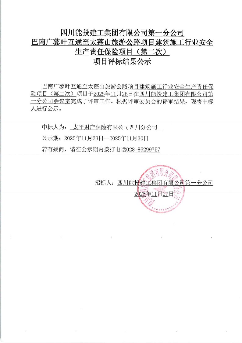 巴南广蓼叶互通至太蓬山旅游公路项目建筑施工行业安全生产责任保险项目(第二次)结果公示